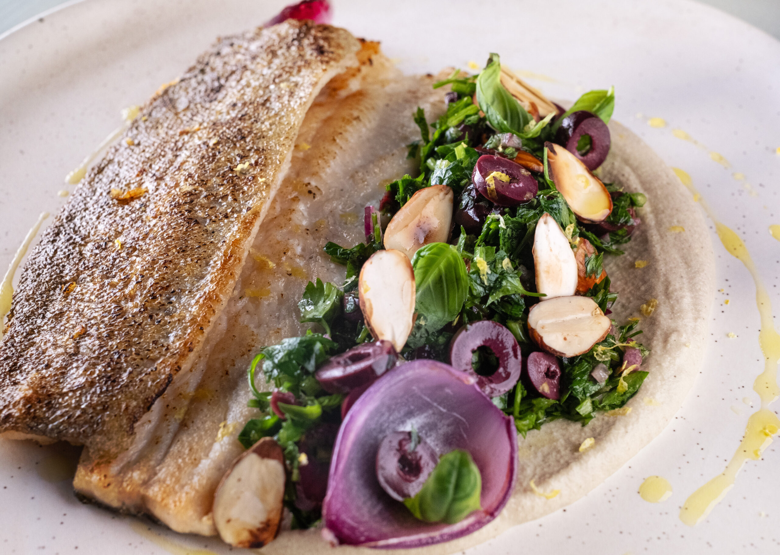 File de păstrăv, piure de tofu, salsa de măsline cu pătrunjel și migdale