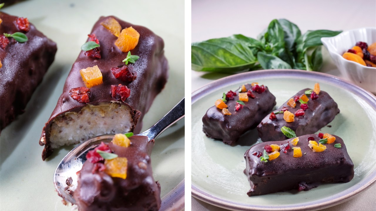 Halva de griș cu semințe de chia, nuci și fructe deshidratate învelită in ciocolată neagră