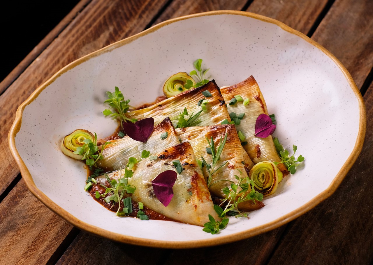 Această rețetă pleacă de la prazul umplut tradițional, dar este gândită într-o formă lejeră, vegetală, de vară: cu tofu și năut în umplutură și un sos barbeque inovator cu roșcove, ce aduce un gust afumat-dulceag, echilibrat de condimente aromate.
