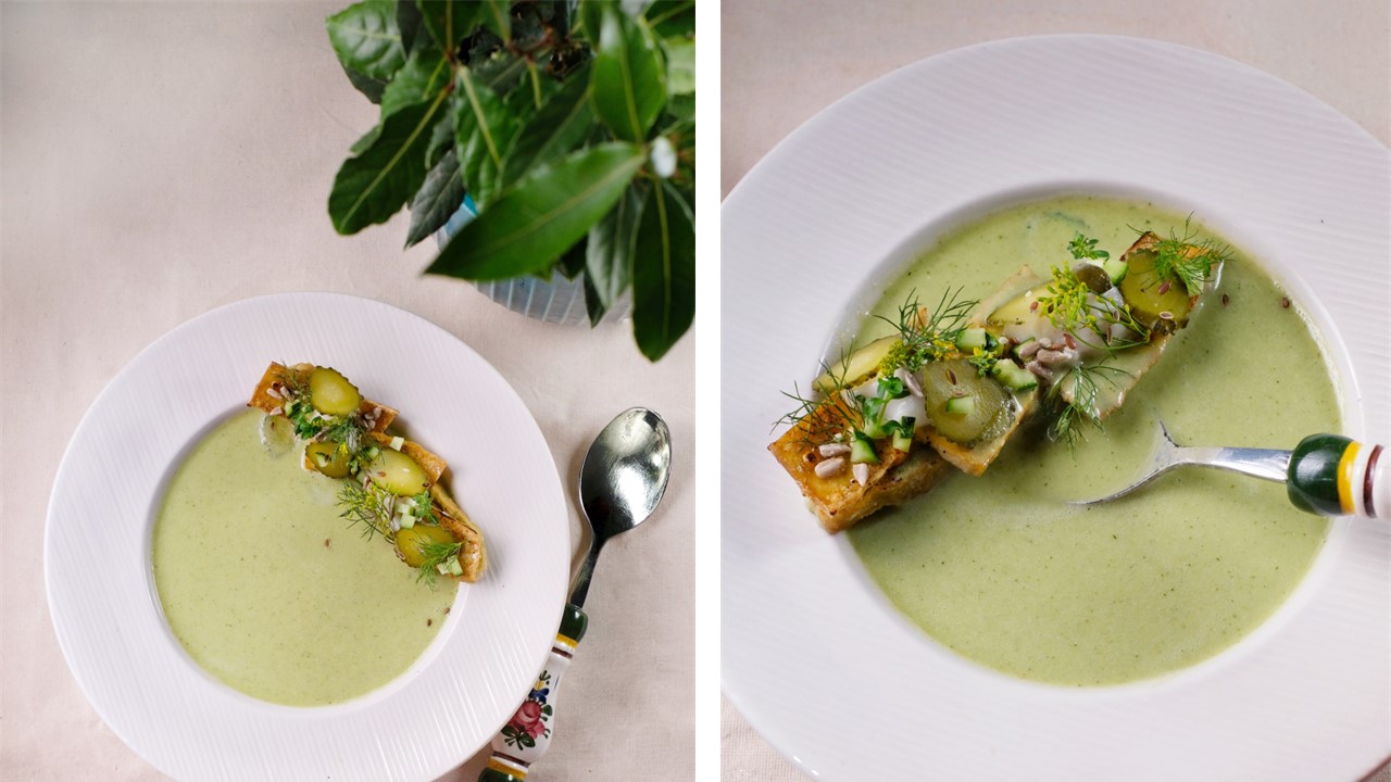 Supă rece de castraveți și dovlecei murați la soare, cu ovăz, iaurt și mărar