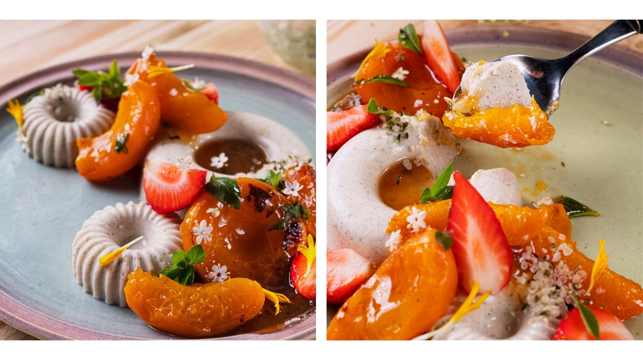 Zalatină de cânepă cu caise caramelizate și busuioc proaspăt