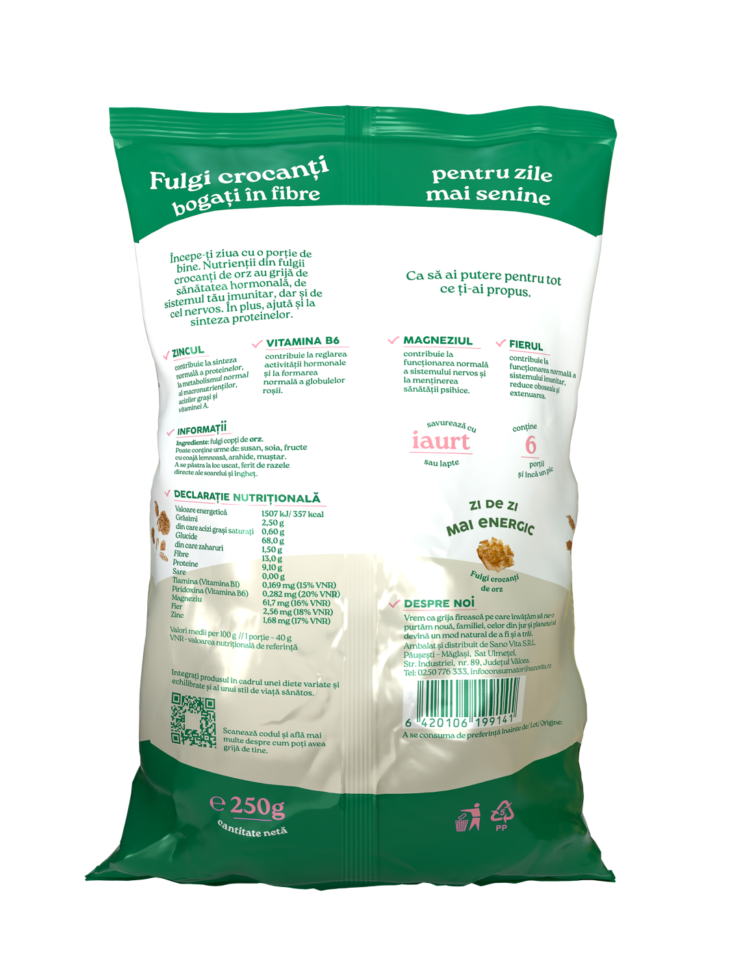 Începe-ți ziua cu o porție de bine. Nutrienții din fulgii crocanți de orz au grijă de sănătatea hormonală, de sistemul tău imunitar, dar și de cel nervos. În plus, ajută și la sinteza proteinelor. Ca să ai putere pentru tot ce ți-ai propus.