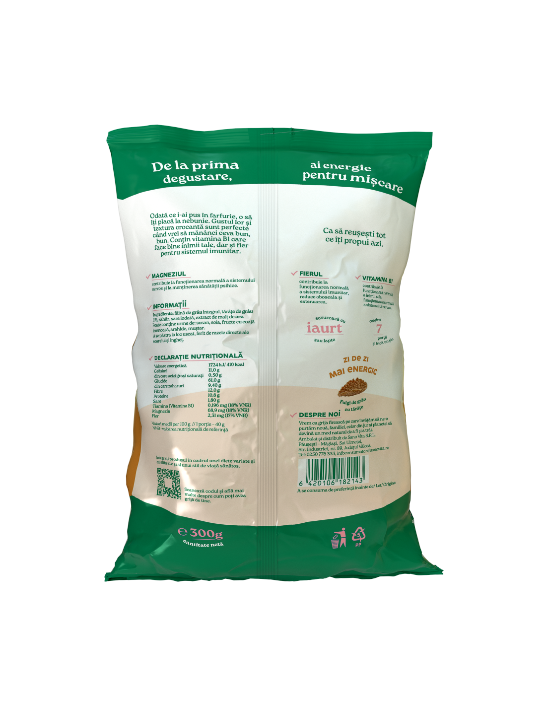 Cu un conținut ridicat de fibre, fulgii de grâu cu tărâțe sunt perfecți pentru o digestie echilibrată. Îi poți consuma la micul dejun cu lapte, iaurt sau băuturi vegetale, dar și ca adaos în budinci sau prăjituri cu cereale integrale.