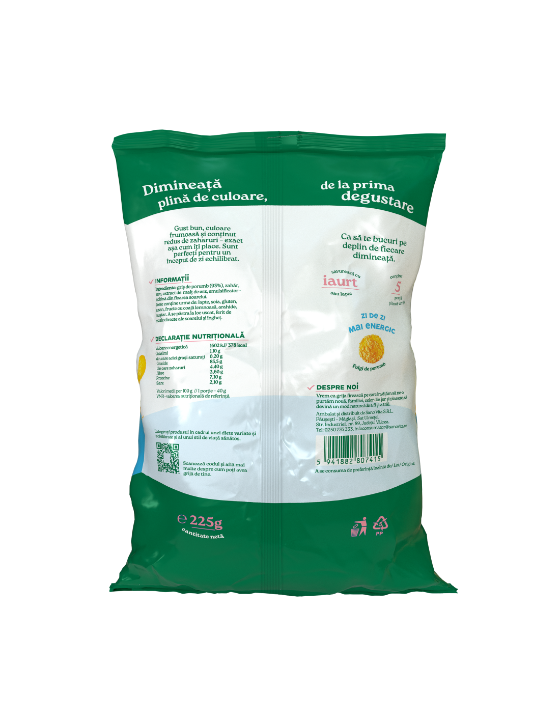 Griș de porumb (93%) (Origine UE), zahăr, sare, malț de orz, emulsificator - lecitină din soia.
