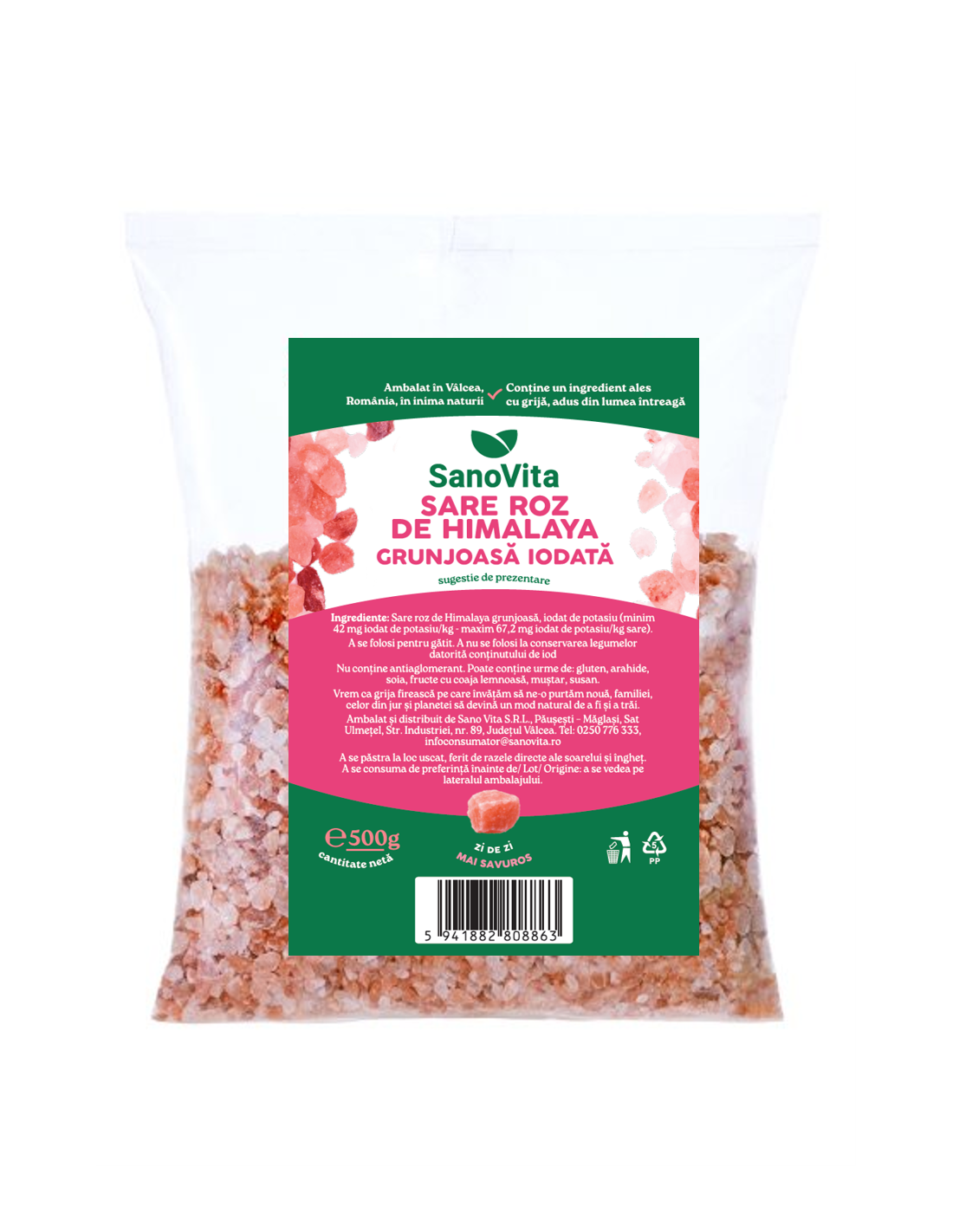 Sare de Himalaya grunjoasă, iodat de potasiu (minim 42 mg iodat de potasiu/kg - maxim 67,2 mg iodat de potasiu/kg sare).